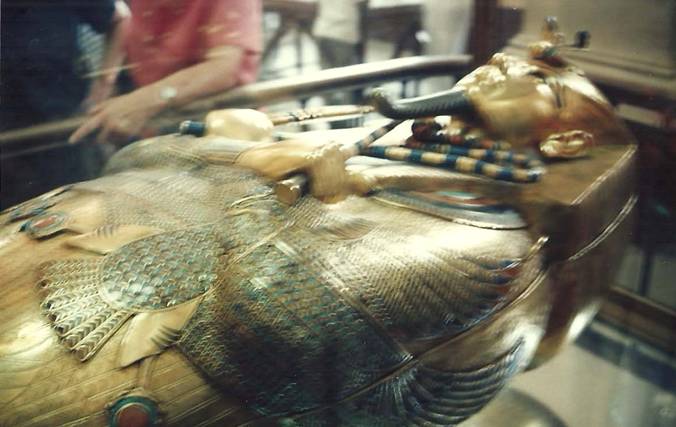 Um dos sarcófagos de Tutancâmon, o mais interno, em formato de múmia exposto no Museu do Cairo. Executado em ouro pesa 110,4 kg. Foto Ismael Gobbo |