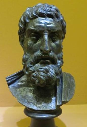 Epicuro. Busto em bronze da “Villa dei Papiri”, Herculano, Itália. Do Museu Arqueológico Nacional de Nápoles, em exposição no Coliseu. Foto Ismael Gobbo. Roma, 23-12-2012 |