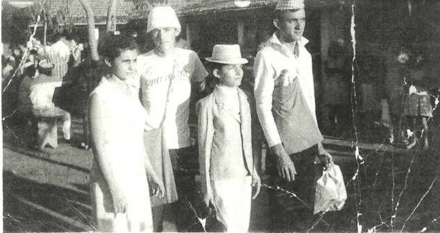 Tarde do Moço Espírita na Instituição Nosso Lar. Integrantes da esquete “Escolinha da dona Bibi”: Ismael Gobbo e as irmãs Neusa e Sonia e João Lucas da Silva (direita). Arquivo Ismael Gobbo. |