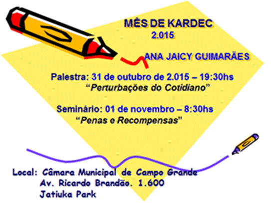 O Instituto de Cultura Espírita de Mato Grosso do Sul - ICEMS, tem a grata satisfação em convidá-los, para participarem do MÊS DE KARDEC, com a Palestrante do Rio de Janeiro: ANA JAICY GUIMARÃES.