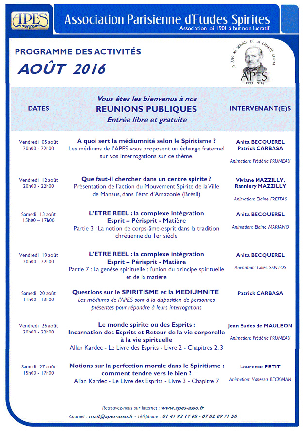 Programação da Associação Parisiense de Estudos Espíritas Paris, França |