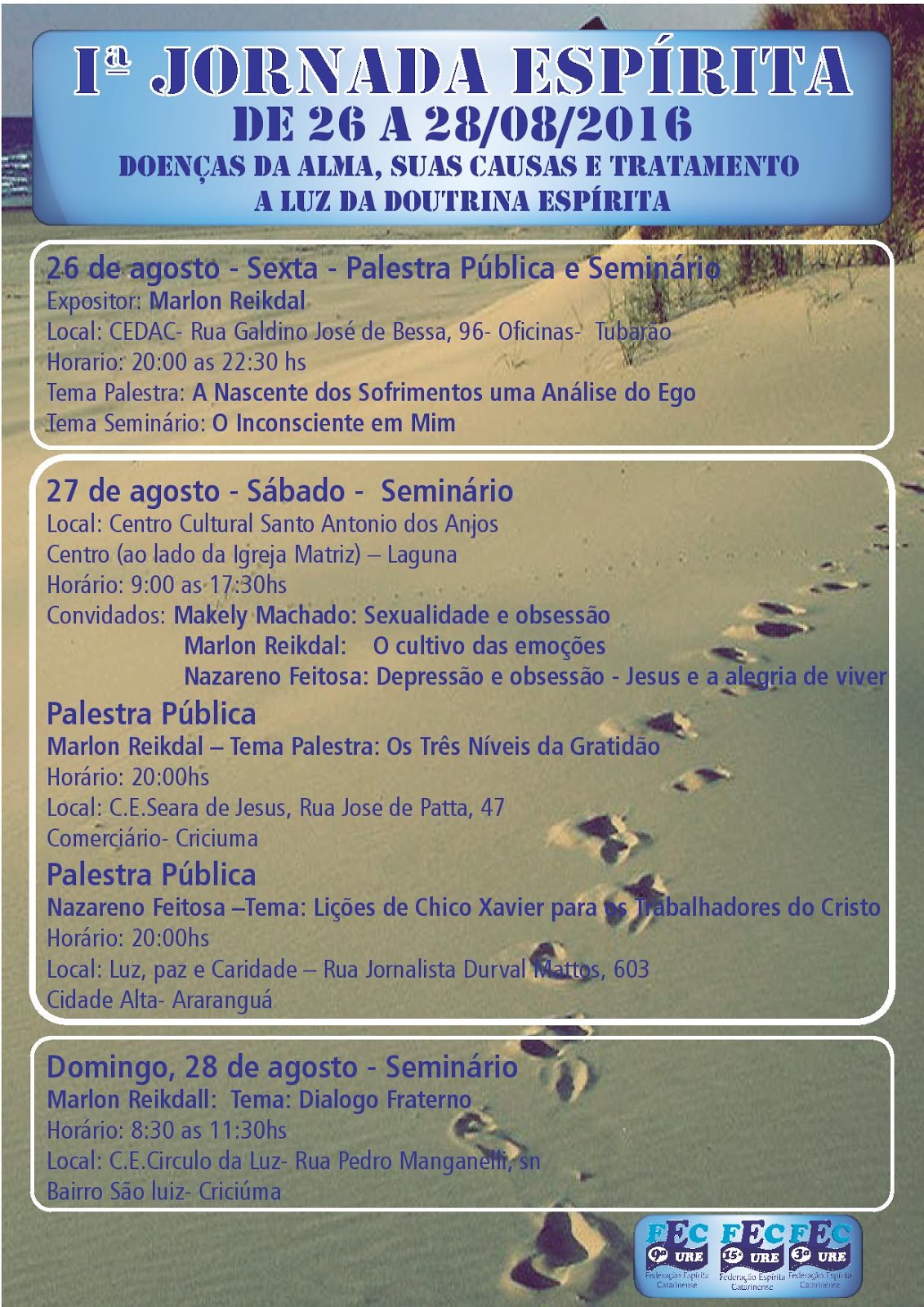 - 26/8 SEX 20h Pal. em Florianópolis - 27/8 SÁB 9h-17h30 1ª Jornada Esp. em Laguna - 27/8 SAB 20h Pal. em Araranguá - 28/8 DOM 9h-11h Sem. em Torres/RS Inf: Valdinei de Freitas <[email protected]> e Eliane <[email protected]>