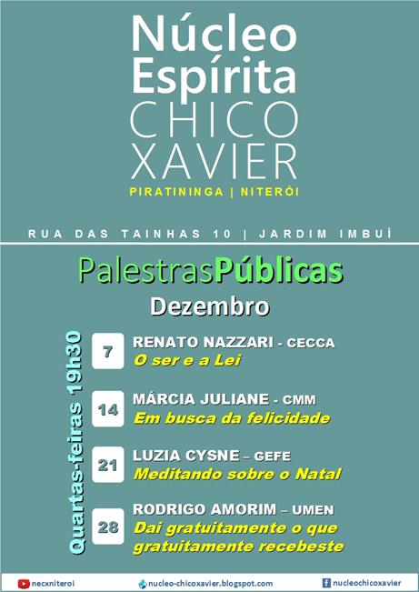 Palestras programadas para o Núcleo Espírita Chico Xavier Niterói, RJ |