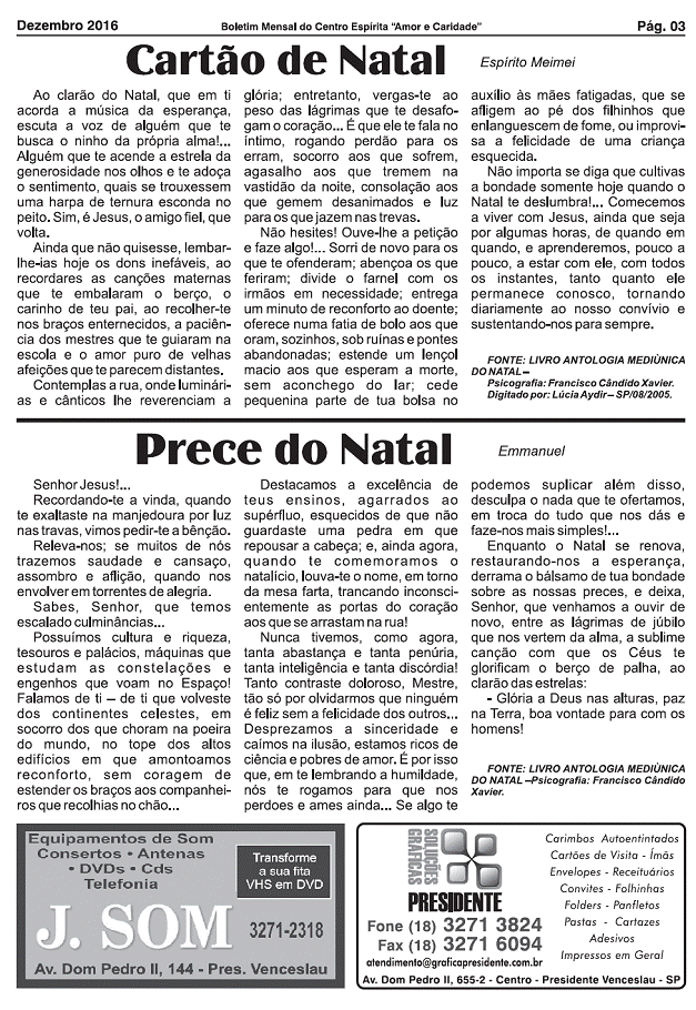 Boletim mensal do C.E. Amor e Caridade Presidente Venceslau, SP |