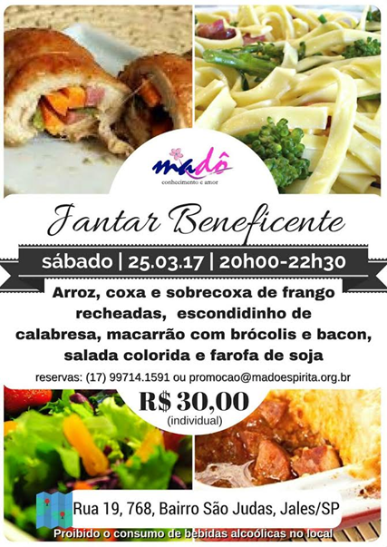 CAROS IRMÃOS, DESEJAMOS CONVIDAR A TODOS PARA NOSSO JANTAR BENEFICENTE EM PROL DAS ATIVIDADES ASSISTENCIAIS E DA MANUTENÇÃO DA CASA DE MADÔ. Endereço: Rua 19, nº 768, Bairro S. Judas Tadeu-Jales,SP. Veja no nosso cartaz abaixo os detalhes. Se desejar pode reservar ingressos também conosco pelo fone: 17-3632.5095 (Dona Lourdes ou David). Venha desfrutar de bons momentos, boa comida e boa conversa. muitíssimo obrigado a todos.