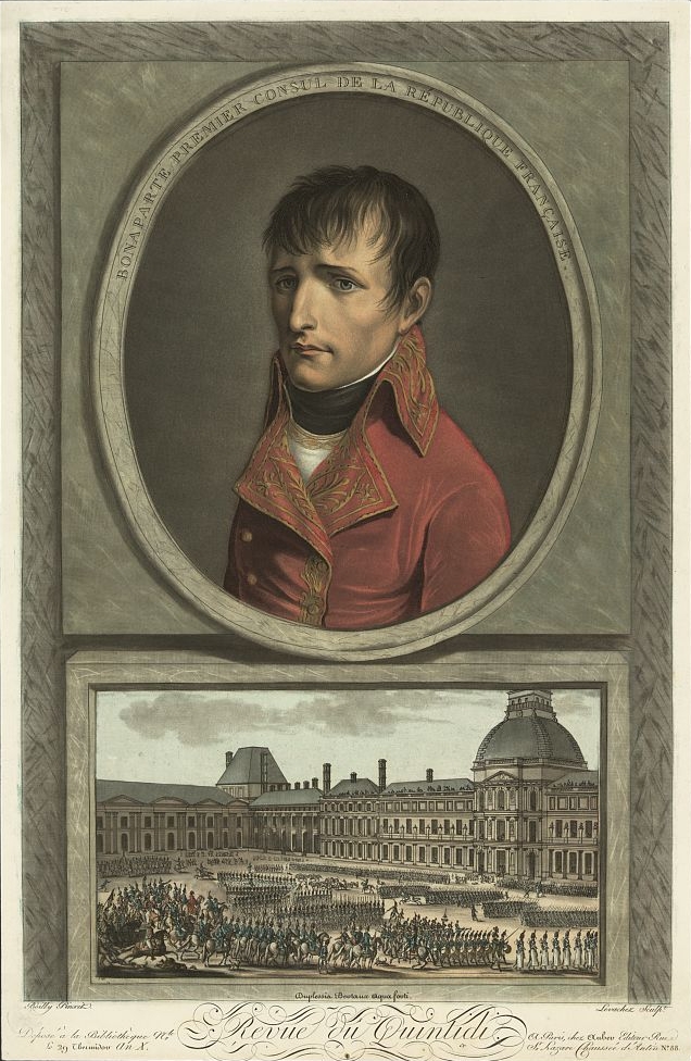 Retrato de Napoleão como primeiro cônsul. Gravura de Charles François Gabriel Levachez segundo Louis-Léopold Boilly (1761-1845). Abaixo do retrato, uma gravura de Jean Duplessi-Bertaux retrata uma revisão de tropas por Napoleão no quinto dia da semana, de acordo com o calendário republicano ("quintidi") no Palais des Tuileries. |