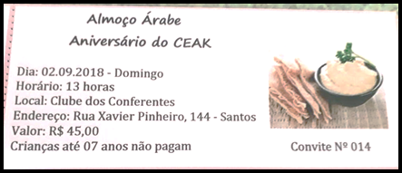 Muito bom dia!!!! Convidamos a todos a participarem no dia 15 de Setembro do nosso SARAU CULTURAL. Horário: Das 17h às 20h. *Entrada 1 kg de alimento não perecível. VOCÊ TAMBÉM PODE PARTICIPAR: Cantando ou dançando uma bela canção, declamando um poema, narrando uma história, encenando uma peça teatral.
