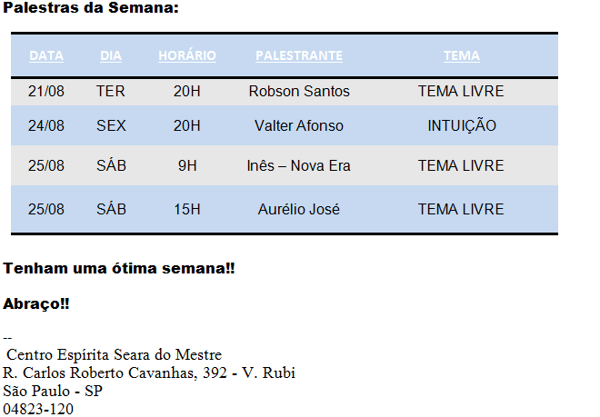 1. Recomendamos confirmar junto aos organizadores os eventos aqui divulgados. Podem ocorrer cancelamentos ou mudanças que nem sempre chegam ao nosso conhecimento. 2. Este e-mail é uma forma alternativa de divulgação de noticias, eventos, entrevistas e artigos espíritas. Recebemos as informações de fontes diversas via e-mail e fazemos o repasse aos destinatários de nossa lista de contatos de e-mail. Trabalhamos com a expectativa de que as informações que nos chegam sejam absolutamente espíritas na forma como preconiza o codificador do Espiritismo, Allan Kardec. Pedimos aos nossos diletos colaboradores que façam uma análise criteriosa e só nos remetam para divulgação matérias genuinamente espíritas.