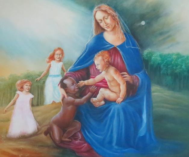 Conforme a autora, o quadro retrata entidade espiritual feminina da falange de Meimei acolitando crianças. Óleo sobre tela da artista plástica Nair Camargo, de São Paulo, SP. Obra exposta no salão de reuniões do Fraternidade Espírita Gina, em São Paulo, Brasil. Foto Ismael Gobbo. |