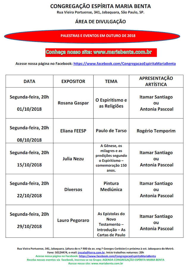 Palestras e eventos programados pela Congregação Espírita Maria Benta. São Paulo, SP |