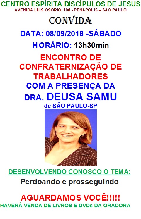 Boa tarde, queridos! Tema: Brasil, a nova Pátria do Evangelho Terça às 19h e às 20h30 Assistência Familiar - Quinta às 20h - Salão 02 A Livraria e Biblioteca Professor Maurício informa que até o dia 08/09, os livros estarão sendo vendidos com o desconto da Feira. O Departamento de Infância e Juventude informa que, devido ao feriado da sexta-feira, no sábado não haverá atividades do Departamento