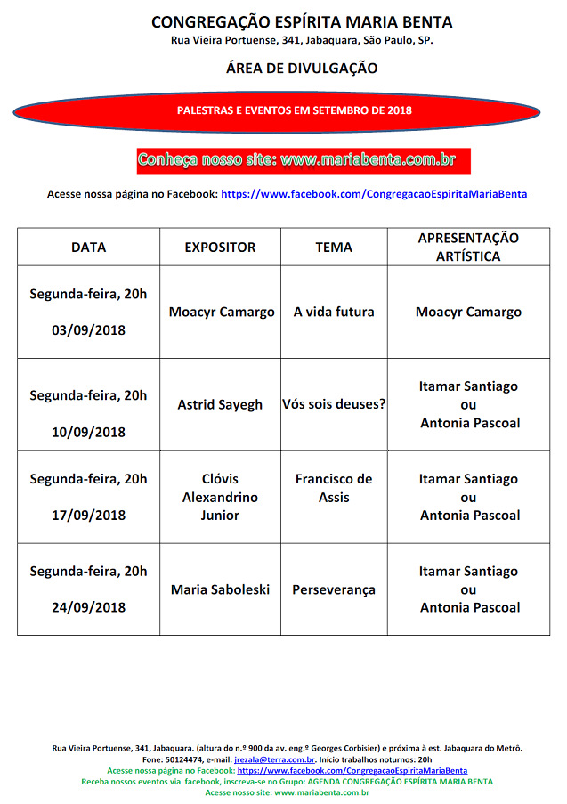 Programação da Congregação Espírita Maria Benta São Paulo, SP |