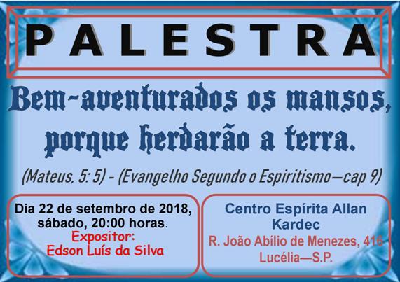 Palestra programada para o C.E. Allan Kardec Lucélia, SP |