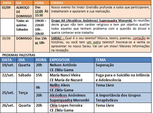 (Informações recebidas em email de Centro Espírita Zilda Gama) |