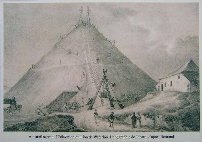 Monte do Leão no local onde se travou a Batalha de Waterloo. Litografia por Jobard após desenho de Bertrand Imagem/fonte: https://en.wikipedia.org/wiki/Marcellin_Jobard#/media/File:Construction-butte_-waterloo_NB.jpg