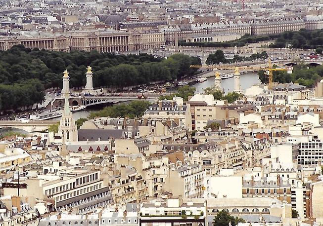 O rio Sena com a Ponte Alexandre III, ornada com belas estátuas douradas; Museu do Louvre e Praça da Concórdia com o obelisco egípcio. Vista a partir da Torre Eiffel. Foto Ismael Gobbo |