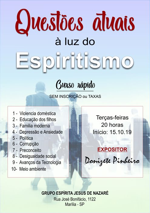 Segunda-feira, 30 de setembro de 2019 de 20:00 a 21:00 Próxima semana Congregação Espírita Maria Benta, Rua Vieira Portuense, 341, Jabaquara. Próxima à estação Jabaquara do metrô.