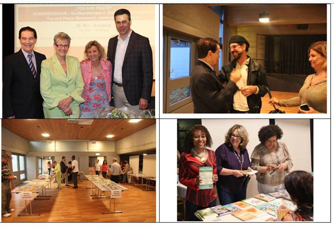 Imagens de Divaldo Pereira Franco com público e equipe do livro na conferência em Zurique, Suiça |