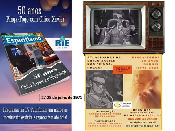 Nos dias 27 e 28 de julho de 1971, era transmitido ao vivo o histórico programa “Pínga-Fogo”, tendo Chico Xavier como entrevistado, na antiga TV Tupi de São Paulo. O evento televisivo alcançou altíssimos índices de audiência e se transformou em um marco da difusão do pensamento espírita. Coroou os esforços do repórter investigativo Saulo Gomes e além dele atuaram como entrevistadores: João de Scantimburgo, Helle Alves, Reali Júnior, José Herculano Pires contando com o jornalista Almyr Guimarães como coordenador. Com simplicidade, desenvoltura e sempre se referindo ao apoio espiritual de Emmanuel, Chico Xavier atendeu a questões dos mais variados matizes do conhecimento e, várias delas, sendo foco de polêmicas na época. Passados 50 anos, ao examinarmos o conteúdo dos comentários feitos por Chico Xavier, verificamos que a maneira doutrinária e prudente por ele desenvolvida, com abordagens que, na sua essência, não ficaram ultrapassadas. Chico respondeu com tranquilidade e segurança a questões polêmicas e claramente valorizou o desenvolvimento da Ciência, como transplantes de órgãos, fertilização “in vitro”, viagens espaciais e outros. Vários dos temas suscitados pelos entrevistadores permanecem presentes nas discussões, pesquisas e em práticas da atualidade. As respostas inspiradas e prudentes de Chico Xavier foram preditivas quando as analisamos após 50 anos do histórico programa. Há vários trechos das respostas de Chico Xavier que merecem nossa reflexão na atualidade. À vista da época conturbada que vivemos, são oportunos alguns realces das manifestações de Chico Xavier, como a tão propalada “época de transição” e são nítidas as expectativas entre os espíritas a propósito da transformação de nosso habitat planetário em mundo de regeneração. Há uma manifestação extremamente ponderada do notável médium quando instado a responder sobre os progressos da Civilização. FCX: “[...] Será o preço da paz. Se pudermos nos suportar uns aos outros, amar uns aos outros, seguindo os preceitos de Jesus, até que essa era prevaleça, provavelmente no próximo milênio, não sabemos se no princípio, se nos meados ou se no fim. O terceiro milênio nos promete maravilhas, mas se o homem, filho e herdeiro de Deus, também se mostrar digno dessas concessões. Senão vamos aguentar nós todos, talvez com as estacas zero ou quase zero para recomeçar tudo de novo.” O sucesso desse programa de julho de 1971 abriu caminho para um segundo “Pinga-Fogo” com Chico Xavier, realizado pela antiga TV Tupi de São Paulo na passagem do dia 20 para 21 de dezembro de 1971.
