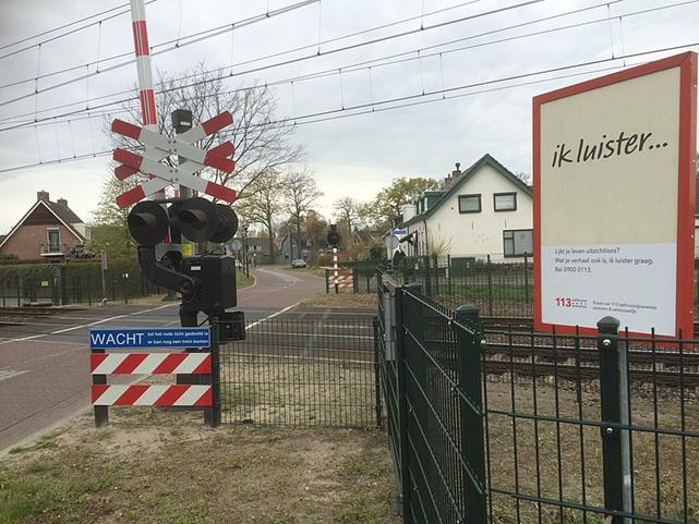 "Eu ouço ..." Sinal da prevenção do suicídio 113 em travessia de ferrovia em Nuenen, Holanda. Imagem/autor: Taketa Copiado de: https://en.wikipedia.org/wiki/Suicide_prevention |