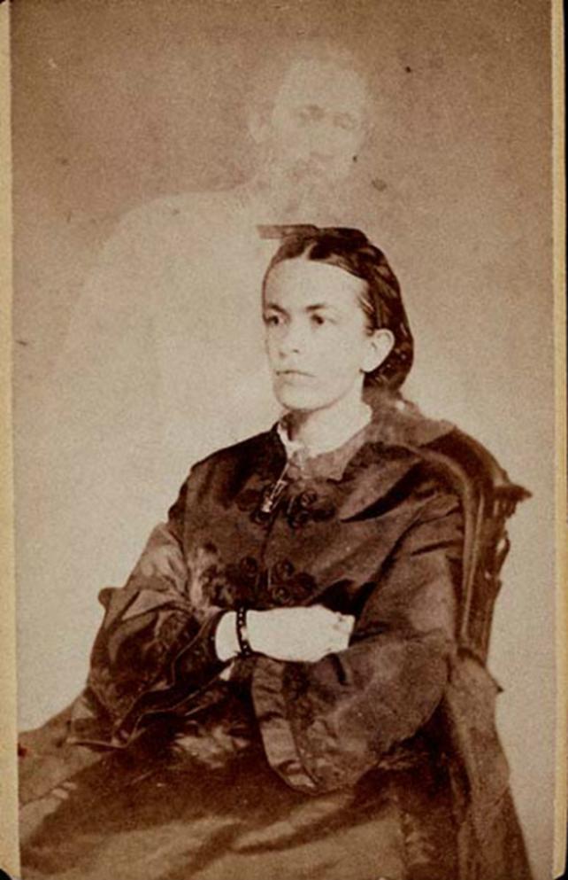 Sra. Conant de Banner of Light. Seu irmão, Charles H. Crowell A imagem fantasmagórica do irmão da médium aparece atrás dela nesta impressão de Albumen carte de visite. Por volta de 1868. Copiado de: https://en.wikipedia.org/wiki/Banner_of_Light