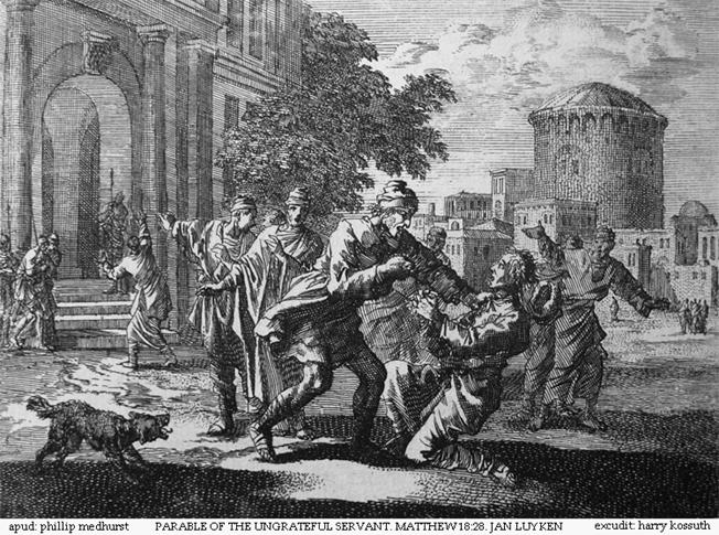 Parábola do servo ingrato Uma gravura de Jan Luyken ilustrando Mateus 18:28 na Bíblia Bowyer, Bolton, Inglaterra. Imagem/fonte: