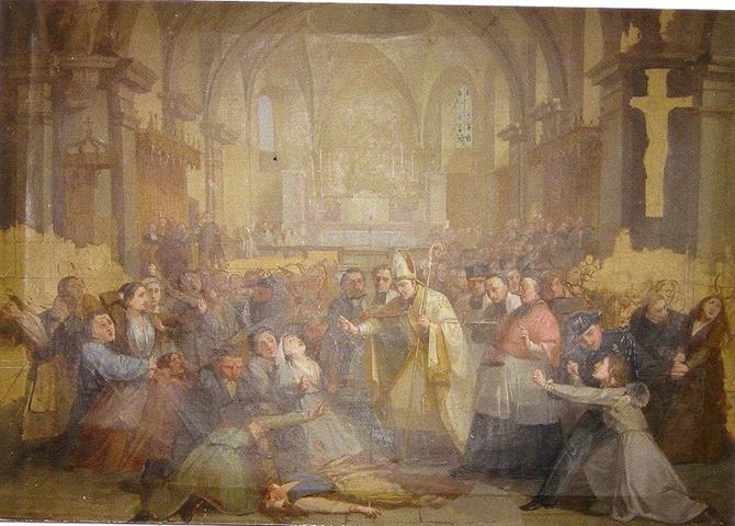 Possuídos de Morzine. Quadro que descreve a cerimônia de confirmação de 1864 em Morzine. O bispo de Annecy molestado pelas mulheres da comunidade "possuído por demônios". Encontro 1864 Pintura em ferro de Laurent Baud (1827-1907) Fonte: https://commons.wikimedia.org/wiki/File:Poss%C3%A9d%C3%A9es_de_Morzine.jpg