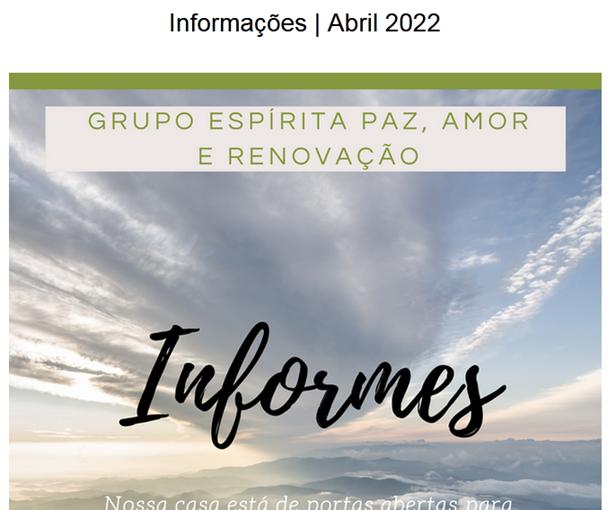 Informações do Grupo Espírita, Paz, Amor e Renovação. Abril/2022. Acesse no link |