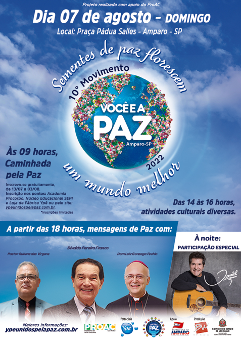 Temos a honra de convidá-lo (a) para participar do 10º Movimento Você e a Paz, que acontecerá pela décima vez em nossa cidade no dia 07 de agosto, domingo, na Praça Pádua Salles – Amparo/SP, e cuja proposta é colaborarmos juntos para uma humanidade mais pacífica e proporcionarmos o cultivo da paz interior nos indivíduos. O Movimento Você e a Paz é uma atividade sem caráter religioso ou político, idealizado por Divaldo Pereira Franco e mobilizado pelo ideal de uma vivência pacífica entre as criaturas humanas, buscando levar os indivíduos a uma reflexão profunda quanto à necessidade de renovação dos sentimentos e mudança de comportamento, a fim de superarmos a atual conjuntura de violência e agressividade em que nos encontramos. Iniciado em 1998 em Salvador, hoje o movimento é promovido em mais de 75 cidades do mundo, sendo 60 delas no Brasil e as demais em 12 países onde o Movimento se expandiu. Foi lançado, inclusive, na sede da ONU, em Nova Iorque, em abril de 2013 e, em seguida, em Miami. Esse momento especial irá se iniciar às 9 horas, com a Caminhada pela Paz e durante o dia, das 14 às 16 horas, ocorrerão atividades culturais diversas para todos os públicos. A partir das 18 horas teremos as mensagens de paz que serão transmitidas por Dom Luiz Gonzaga Fechio, Bispo Diocesano de Amparo; Pastor Rubens das Virgens, da Assembleia de Deus Ministério do Belém de Amparo e Divaldo Pereira Franco, fundador do Movimento, Médium e Orador Espírita; seguidas da apresentação do cantor Daniel. Ressaltando a importância deste encontro, e por mais esta oportunidade de confraternização entre todos nós, muito nos gratificaria recebê-lo (a) neste evento. Fraternalmente.