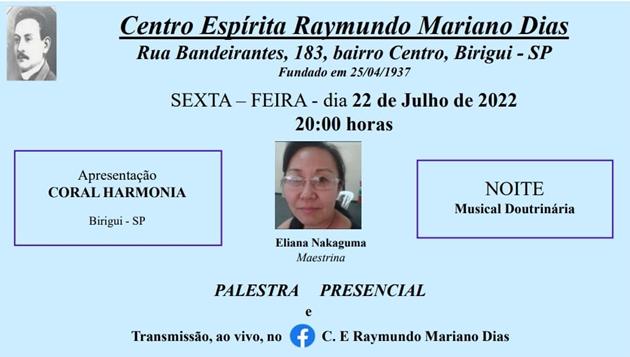 22/07/2022 - às 20hs 🗣️ APRESENTAÇÃO: Coral Harmonia 🎼 MAESTRINA: Eliana Nakaguma . À partir das 19h30min inicia o ❤️ATENDIMENTO FRATERNO❤️ À partir das 20hs inicia a 👧👦EVANGELIZAÇÃO Infantil e Pré-Mocidade. . 🙌🏻 Higiene das Mãos 🎥 A palestra também será transmitida pelo Facebook do C. E Raymundo Mariano Dias: https://www.facebook.com/ceraymundomarianodias . Sejam Bem Vindos(as)!!!