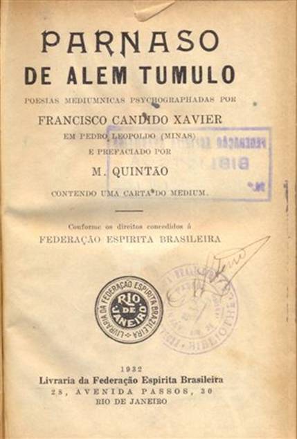 Rosto da 1ª. Edição do livro Parnaso de Além Túmulo, no ano de 1932 e Capa do mesmo livro na edição de 1939, que é a mais conhecida. Arquivo da FEB.