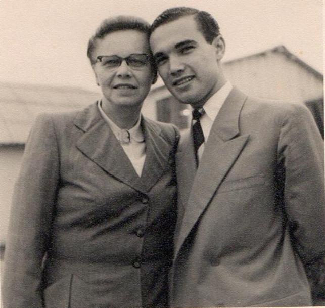 Dona Zaira Pitt com o jovem conferencista e médium Divaldo Pereira Franco. D. Zaira foi quem fez o convite e hospedou Divaldo para a primeira palestra em São Paulo, na FEESP, em janeiro de 1951. Foto: acervo do Grupo Socorrista Zaira Pitt, São Paulo, Brasil.