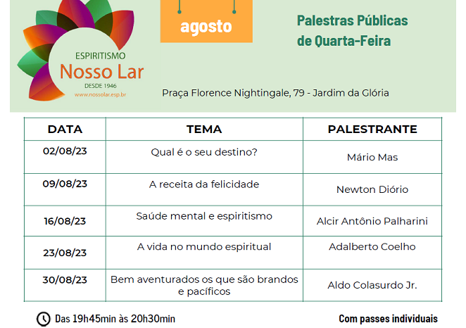 Caro Ismael Gobbo, agosto é um mês especial e repleto de celebrações aqui na IBNL, pois marca o aniversário de sua fundação ao completar 77 anos no próximo dia 08 de agosto de 2023. Em anexo segue a programação de palestras e as apresentações do coral Fonte Viva, em comemoração ao aniversário do Nosso Lar e tb com a participação especial do querido Allan Vilches. Contamos com a presença dos leitores do seu trabalho exemplar de divulgação do Movimento Espírita. Forte abraço e nossa gratidão por srmpre nos prestigiar com as divulgações. Clodoaldo de Lima Leite Presidente voluntário da IBNL
