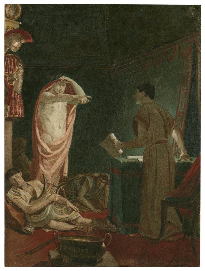 Uma pintura do final do século 19 do Ato IV, Cena III de Júlio César de Shakespeare: Brutus vê o fantasma de César. Imagem/fonte: https://commons.wikimedia.org/wiki/File:Brutus_sees_Caesar%27s_ghost.jpg