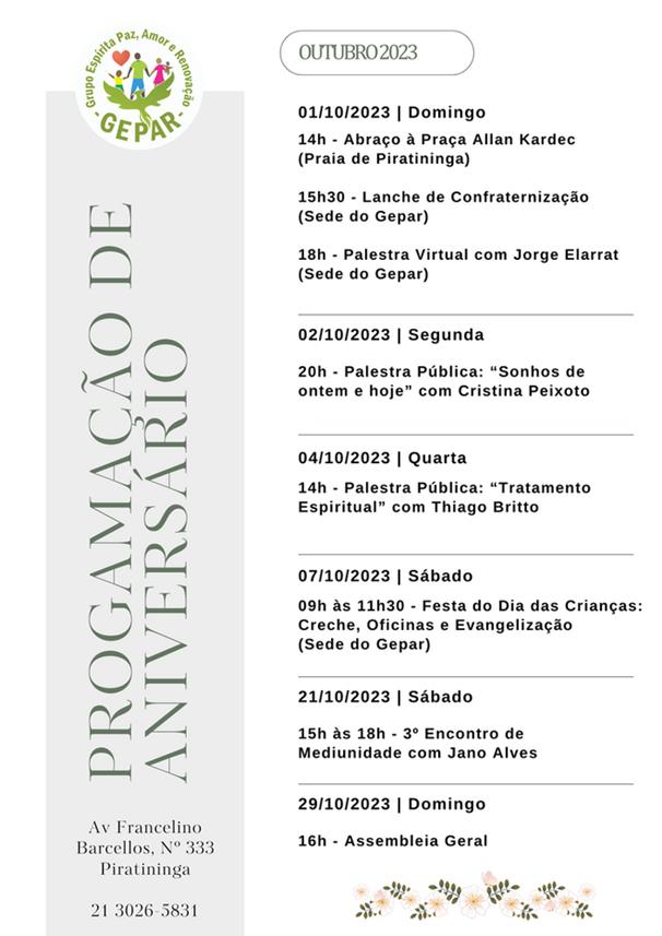 GEPAR - 32º. Aniversário – Programação-Mês de Outubro Niterói, RJ |