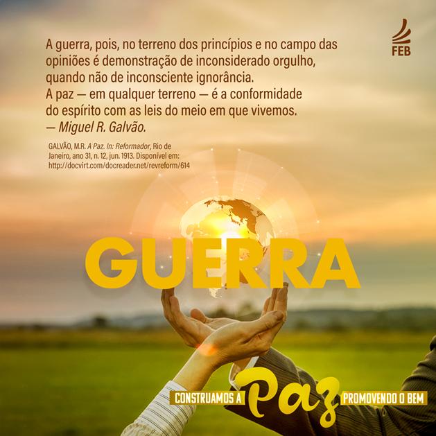 A guerra, pois, no terreno dos princípios e no campo das opiniões é demonstração de inconsiderado orgulho, quando não de inconsciente ignorância. A paz — em qualquer terreno — e a conformidade do espírito com as leis do meio em que vivemos. — Miguel R. Galvão. GALVÃO, M.R. A Paz. In: Reformador, Rio de Janeiro, ano 31, n. 12, jun. 1913. Disponível em: http://docvirt.com/docreader.net/revreform/6140 A paz é tema de constante e necessário debate e reflexão. Em Reformador do ano de 1913, extraímos a palavra-chave de hoje: guerra. Pra você, a guerra é o oposto de paz? A Federação Espírita Brasileira em parceria com as federativas estaduais apresenta a campanha Construamos a Paz, promovendo o bem!, visando o diálogo e debate nos lares, nos centros, estimulando a reforma íntima e a desejada conscientização individual e coletiva.