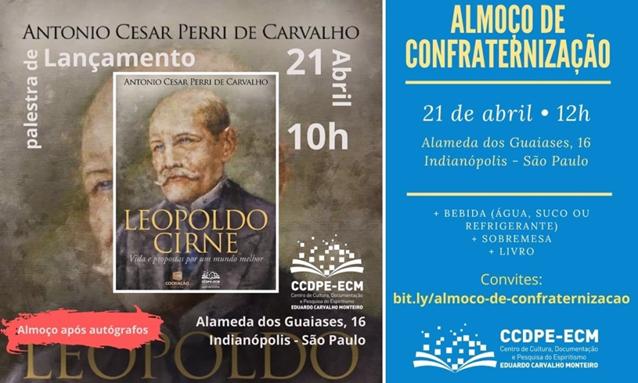 No dia 21 de abril – domingo - às 10 horas, o Centro de Cultura, Documentação e Pesquisa do Espiritismo-CCDPE promoverá o lançamento do livro “Leopoldo Cirne. Vida e propostas por um mundo melhor”, com palestra pelo autor Antonio Cesar Perri de Carvalho. O CCDPE está situado na Alameda dos Guaiases, 16, bairro Indianópolis, São Paulo. Em seguida, às 12 horas, haverá almoço de confraternização (com carne e vegetariano). Os convites podem ser adquiridos pelo link: bit.ly/almoco-de-confraternizacao.