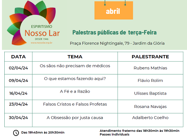 Programação de palestras da Instituição Beneficente Nosso Lar. Abril/2024. São Paulo, capital. |