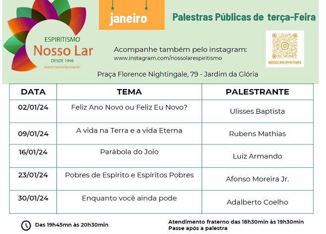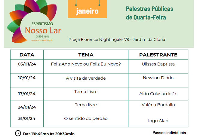 Palestras da Instituição Beneficente Nosso Lar – IBNL de janeiro 2024. São Paulo, capital. |