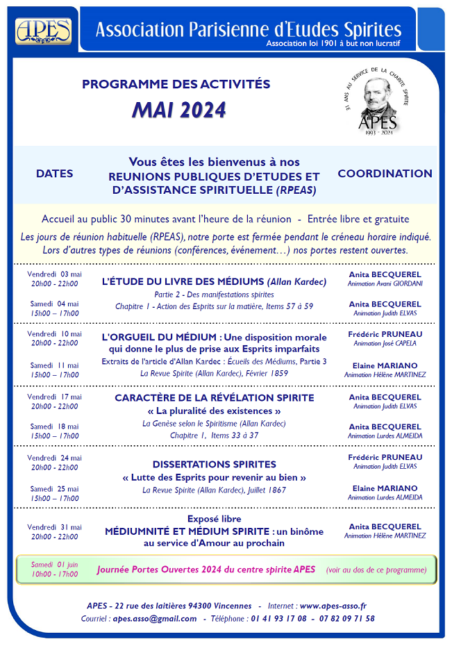 Programação do APES- Associação Parisiense de Estudos Espíritas. Maio/2024. Paris, França |