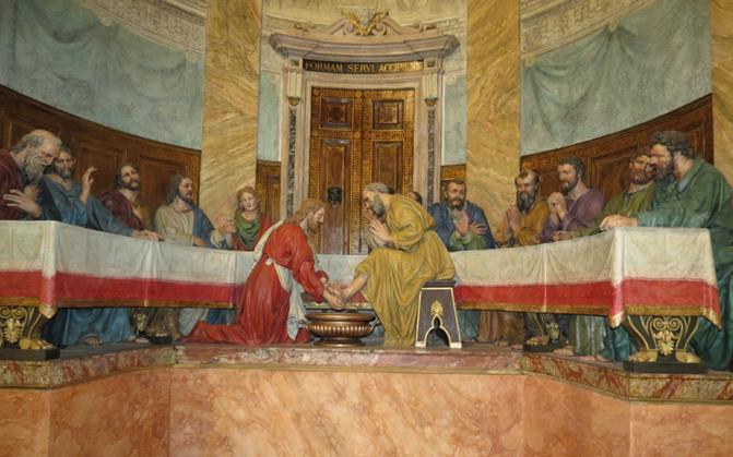 A Última Ceia com a cena de Jesus lavando os pés dos apóstolos. Grupo em terracota de tamanho natural. Igreja do Santo Sepulcro, Milão, Itália. Foto Ismael Gobbo
