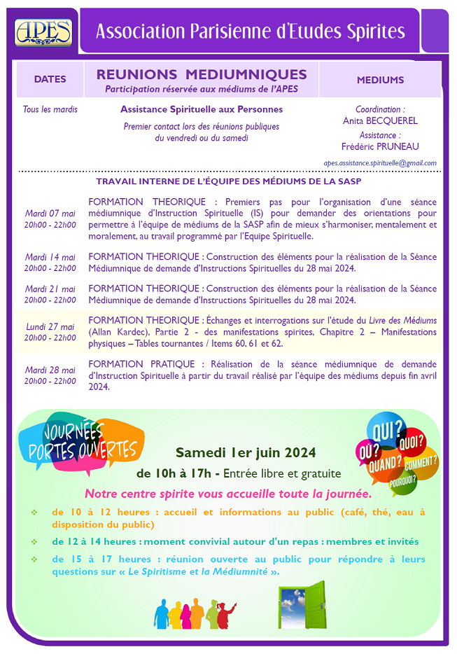 Programação do APES- Associação Parisiense de Estudos Espíritas. Maio/2024. Paris, França |