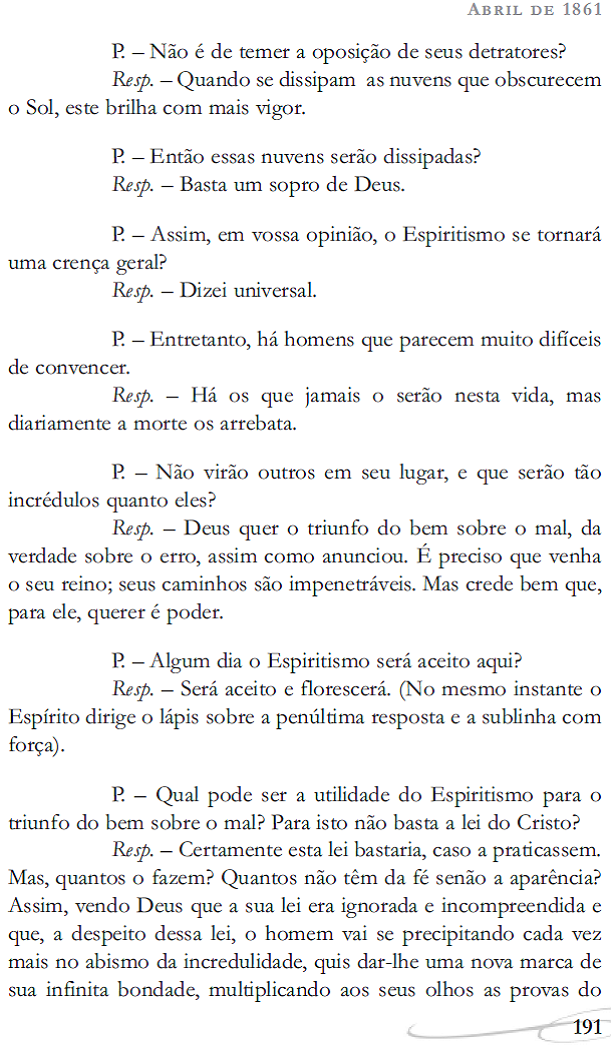 Pelo Espírito Emmanuel. Psicografia de Francisco Cândido Xavier. Livro: Justiça Divina. Lição nº 53. Página 125. Estudos e Dissertações em torno da substância religiosa de “O Céu e o Inferno”, de Allan Kardec. 1ª parte, Capítulo III, Item 13. Reunião pública de 25/08/1961.