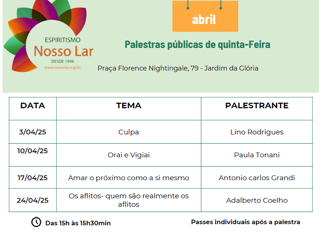 Programação das palestras do mês de abril da Instituição Beneficente Nosso Lar. São Paulo, capital |