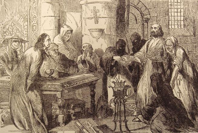 Interrogatório de Jacques de Moulay. Impressão do século XIX. Reprodução em "Uma história ilustrada dos Cavaleiros Templários", James Wasserman. Imagem/fonte: https://commons.wikimedia.org/wiki/File:InterrogationOfJacquesDeMolay.JPG |