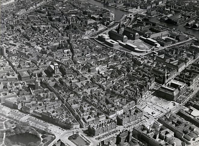 Copenhague Descrição Dinamarquês: Slotsholmen. Vista da Jarmers Plads. Data: 1939 Fonte: http://samlinger.natmus.dk/DMR/58081 Autor: Museu Nacional, Aero Express Imagem/fonte: https://commons.wikimedia.org/wiki/File:K%C3%B8benhavn_fra_luften_Dmr_topkbh_k_07121.jpg |