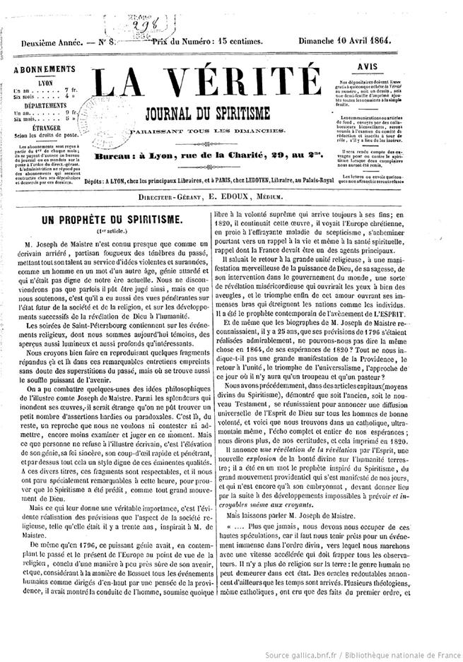 Leia o jornal “La Vérité” de 10 de abril de 1864 a que se refere Allan Kardec na matéria da Revista Espírita de maio de 1864, reproduzida nesta postagem. Veja acima. Clique aqui: https://gallica.bnf.fr/ark:/12148/bpt6k5811727k/f1.item |