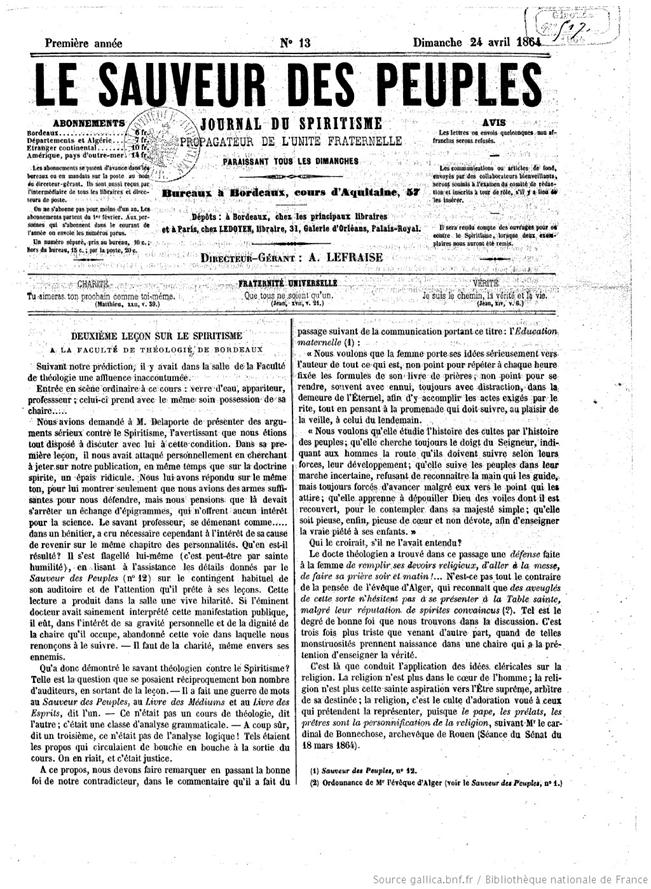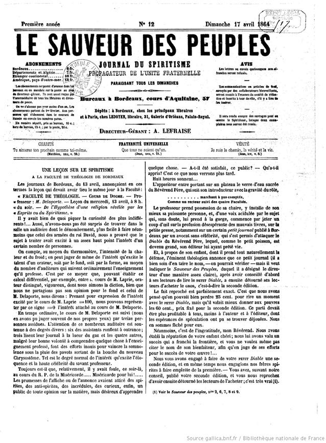Leia o jornal “La Sauveur des Peuples” de 17 de abril de 1864 a que se refere Allan Kardec na matéria da Revista Espírita de maio de 1864, reproduzida nesta postagem. Veja acima. Clique aqui: https://gallica.bnf.fr/ark:/12148/bpt6k5847577g.item |