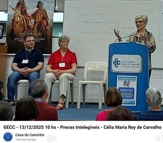 O tema “preces inteligíveis” foi desenvolvido por Célia Maria Rey de Carvalho, ao comentar itens do Cap. 27 de “O Evangelho segundo o Espiritismo”, na reunião pública matutina do dia 13 de dezembro no Grupo Espírita Casa do Caminho, em São Paulo. A reunião foi coordenada por Lúcia Travençolo, com a participação de Rogério Ferraro. Esse Centro localizado na Vila Mariana, na capital paulista, mantém reuniões públicas e transmitidas pela internet, de 2ª a 6ª feira, às 14 e às 19 horas; aos sábados e domingos pela manhã. Assista pelo link: https://www.youtube.com/watch?v=CGxsz251u1U