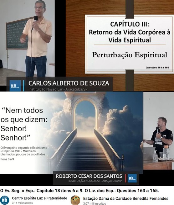 Na reunião pública do dia 02/11/2025, na Instituição Nosso Lar, Araçatuba (SP), o tema "nem todos os que dizem Senhor, Senhor" de "O Evangelho Segundo o Espiritismo" (Capítulo 18) foi desenvolvido por Roberto Cesar dos Santos, e o tema "perturbação espiritual" ("O Livro dos Espíritos", q. 163-165) foi abordado por Carlos Alberto de Souza. A reunião pública é transmitida pela Instituição e pela Estação Dama da Caridade Benedita Fernandes. Acesse pelo link: https://www.youtube.com/watch?v=yftCbzGkC7s